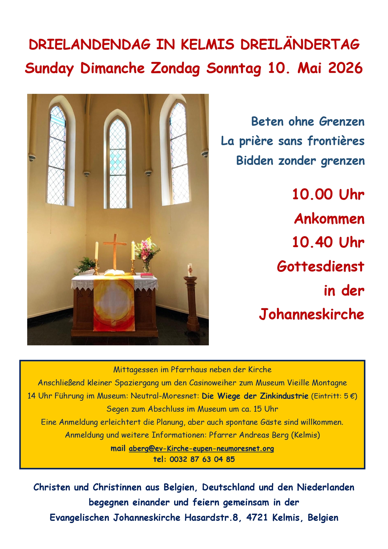 Home › Uncategorized › Beten ohne Grenzen – 10. Mai 2026 Beten ohne Grenzen – 10. Mai 2026 Aktualität lokale Aktivität Uncategorized Posted on 27/03/2026 • Updated 27/03/2026 —by @min 3 0 Share on FacebookTweet on TwitterGoogle+LinkedInPinterest Share on FacebookTweet on TwitterGoogle+LinkedInPinterest Post navigation Previous PostJubiliäumskonzert Neu-Moresnet